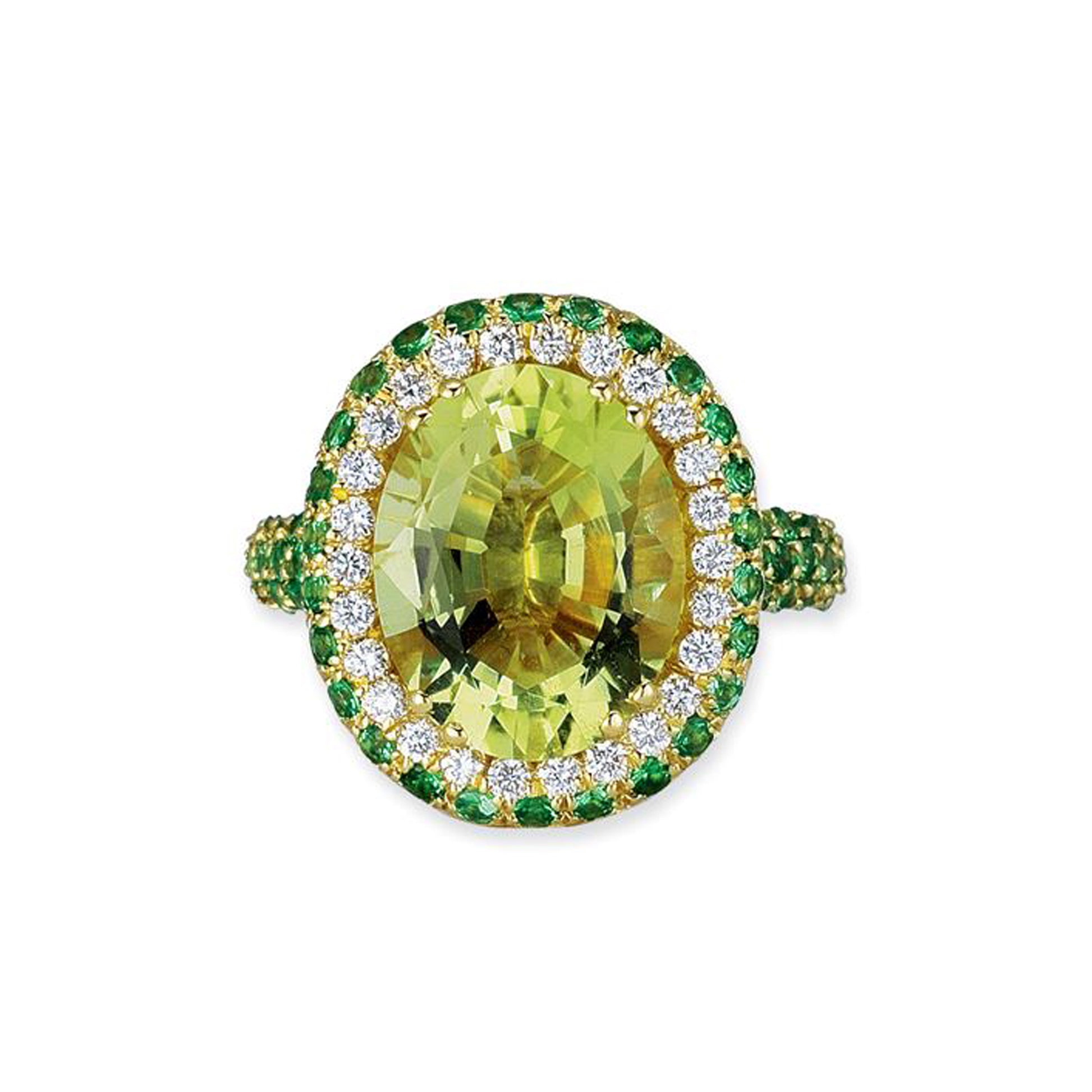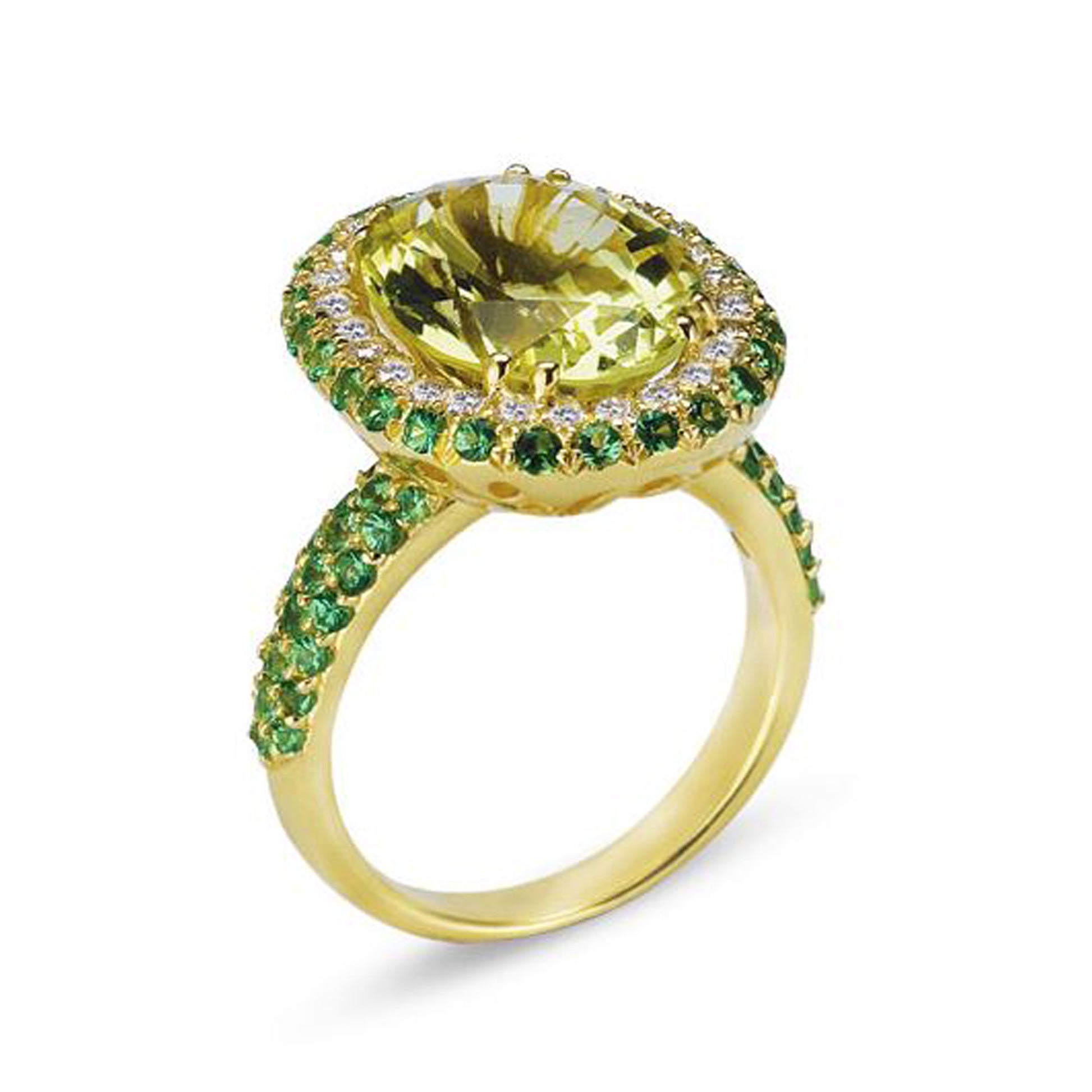 18K YELLOW GOLD RING WITH DIAMONDS TSAVORITE AND LEMON QUARTZ