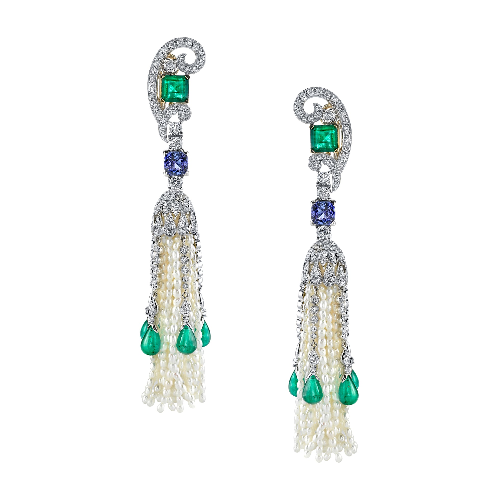 18K White Gold Seed Pearl Emerald Tanzanite And Diamond Earrings