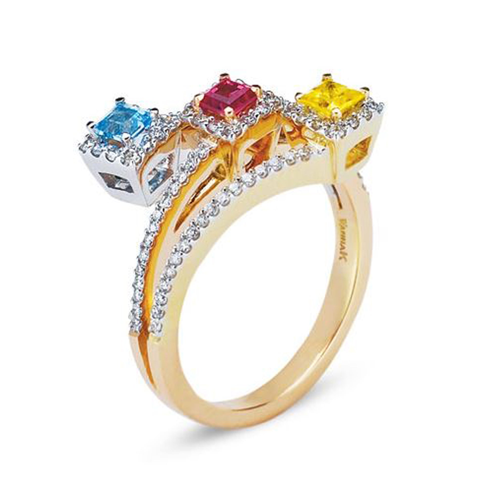 18K Tri Color Birthstone Ring With Diamonds And Colored Stones