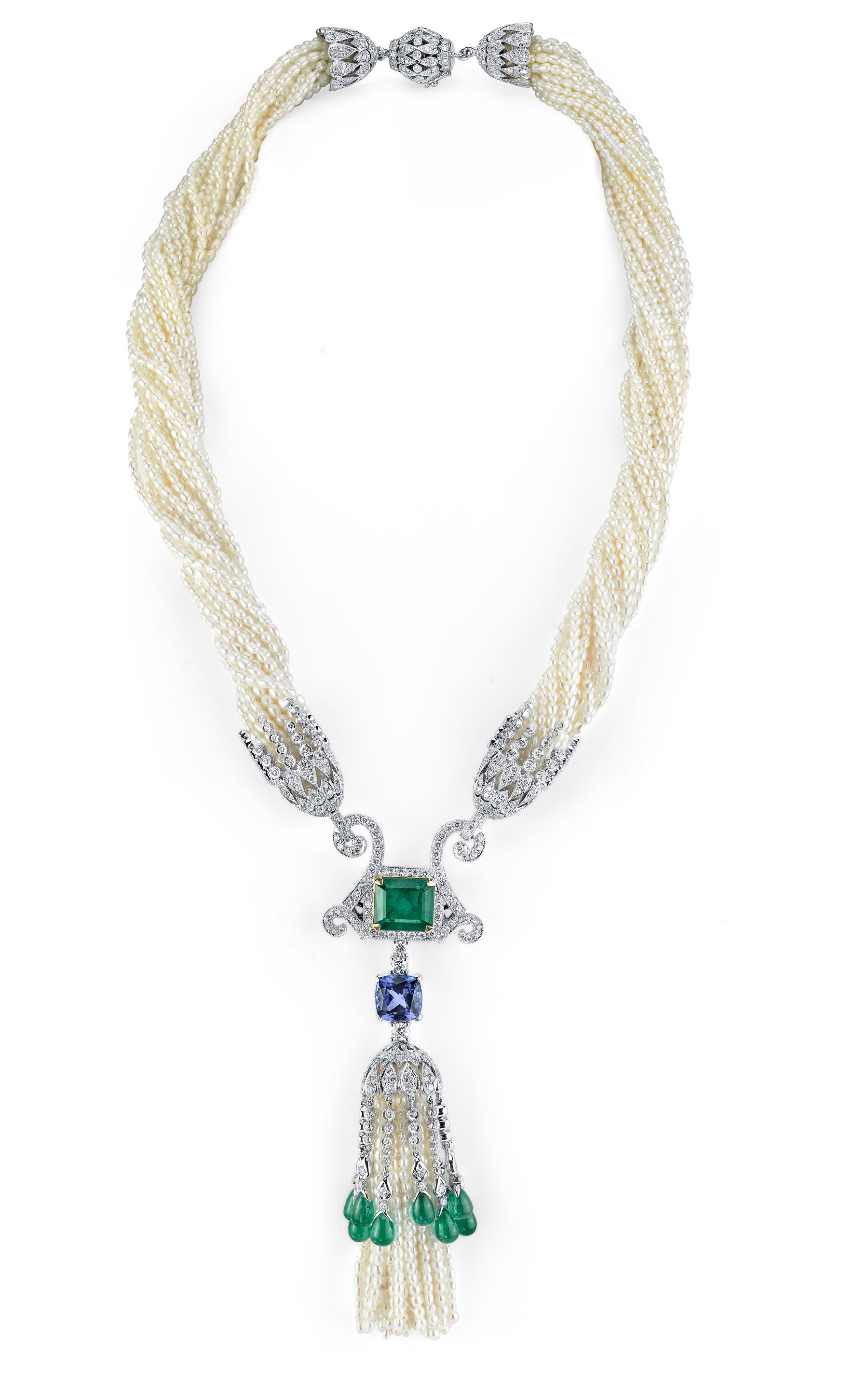 18K Sead Pearl Necklace With Emeralds Diamonds And Tanzanite