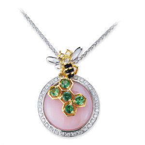 18K Two Tone Bee Diamond Necklace With Tsavorite Rose Quartz And Black Agate