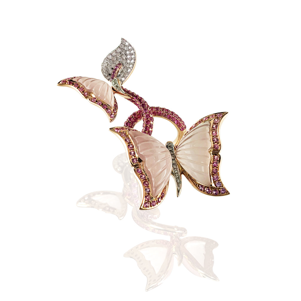 18K Rose gold butterfly's ring with diamonds sapphire and rose quartz
