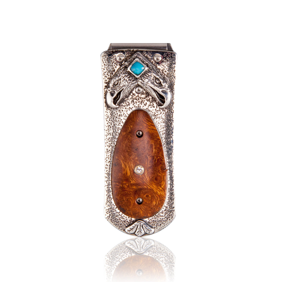 The Zurich ‘Bisbee’ is a beautiful money clip featuring a frame in hand-carved sterling silver with turquoise accents by Lee Downey, inlaid with desert ironwood, and a white topaz gem stone. The clip is machined and polished from tempered stainless steel, with a beautiful engraving bright cut against the matte-finished background. The ‘Bisbee’ money clip is a beautiful, and functional personality statement featuring some of the unique materials and forged metals that are the hallmark of William Henry's collections; a timeless heirloom to be proudly worn and used for a lifetime before handing it down to another generation.
