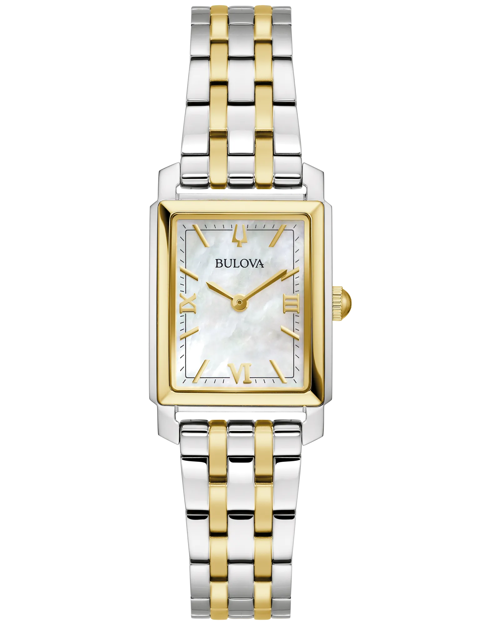 This all-new Bulova ladies’ timepiece adds new style to the already impressive Sutton Collection. The elegant two-tone stainless rectangular steel case with a silver-tone body and a gold-tone frame around the mineral crystal. The opalescent mother-of-pearl dial is accented with gold-tone hour markers and matching hands for a look of true sophistication. A matching five-link bracelet features a deployant closure with pushers for a perfect fit. This Bulova ladies’ timepiece is perfectly styled for the woman who is ready to make a statement.