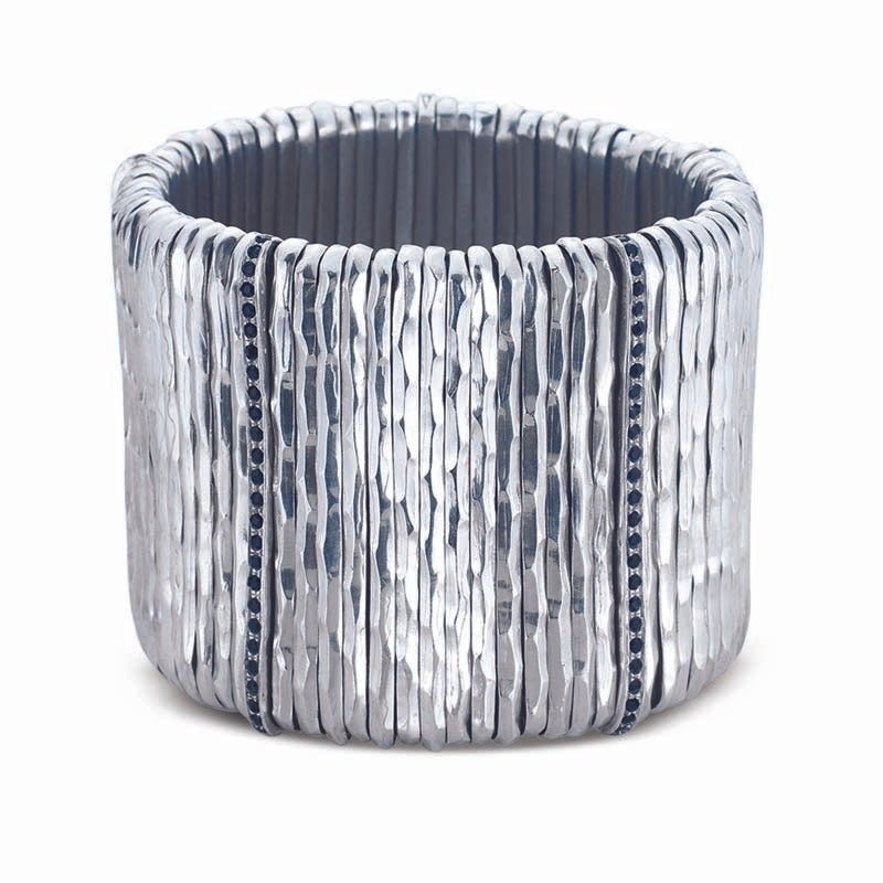 This large silver rhodium plated bracelet is handmade in Italy with brass and encrusted with black crystals.