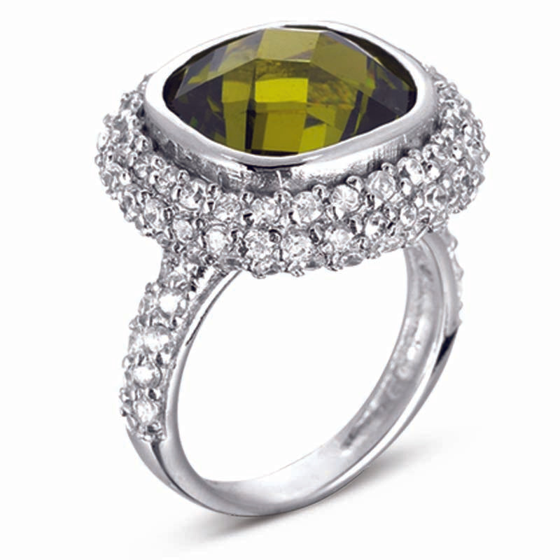 STERLING SILVER RING WITH SQUARE OLIVE CENTER AND CLEAR CZ STONES