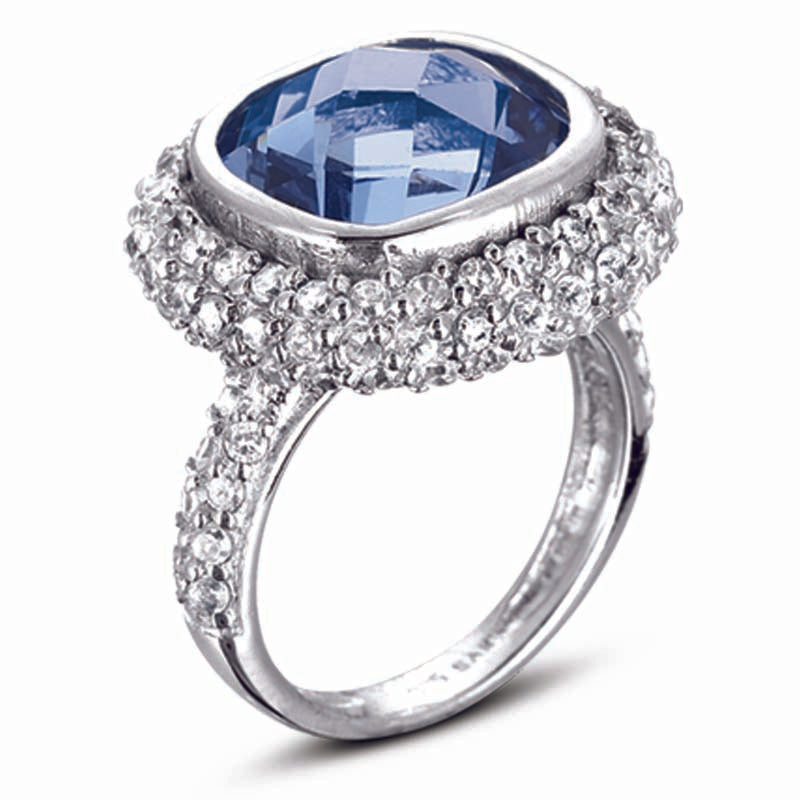 A must have this sterling silver ring has a square blue center stone with clear cubic zirconia stones wrapped around the ring. Available in sizes 5-9.