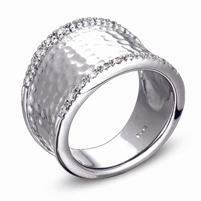 Bohemian yet classic! This ring has a hammered look featuring genuine cubic zirconia stones on the edge of this sterling silver band.Available in sizes 5-9.