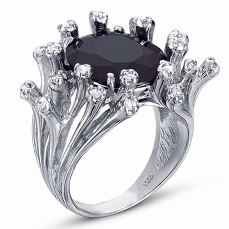 Botanical inspiration make this sterling silver ring a must-have! Giant black cubic zirconia center stone is framed by clear cubic zirconia stones.Upright rose like prongs complete the look.Available sizes 5-9