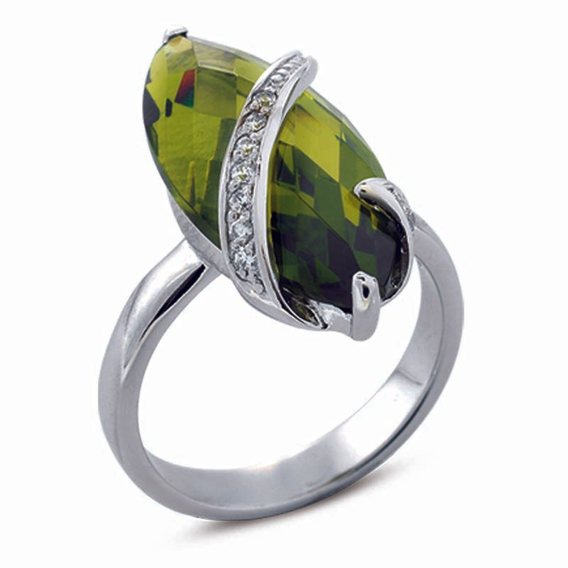 Sterling silver ring with a multi-faceted marquee shaped olive color cz.