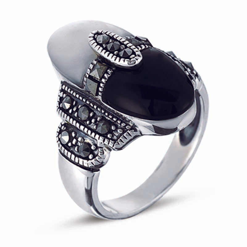 Opposites attract with this sterling silver ring made of genuine marcasite,black onyx and white mother of pearl cabochon.