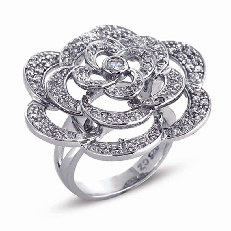 Brilliant cubic zirconia stones accent a dramatic flower ring that's full of sparkle.