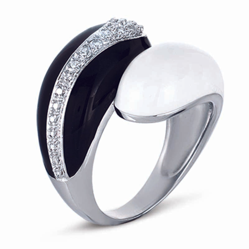 This sterling silver black and white epoxy ring is accented with clear sparkling cubic zirconia stones making it a statement ring! Available in sizes 5-9.