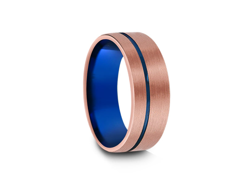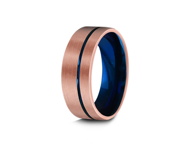 8MM BRUSHED ROSE GOLD TUNGSTEN WEDDING BAND BLUE LINE AND BLUE INTERIOR